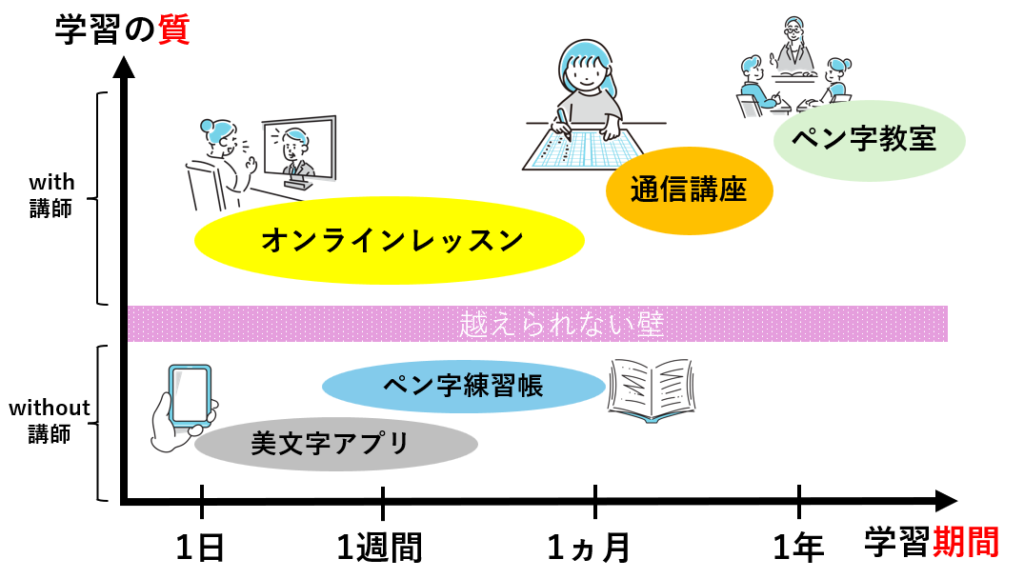 ペン字初心者になるための学習法や教材は多々ありますが、誤った学び方を選ぶと成果が出ず、場合によっては挫折につながります。