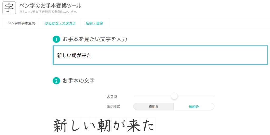 そんな方におすすめなのが、美文字のお手本を作ってくれるツールです。好きな文字を入力すれば簡単にきれいな字の見本に変換してくれます。