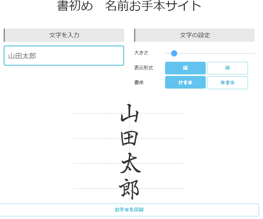 | 書初め 名前お手本サイト | 手書き風、行書もあり | 印刷のみ | 無料 |