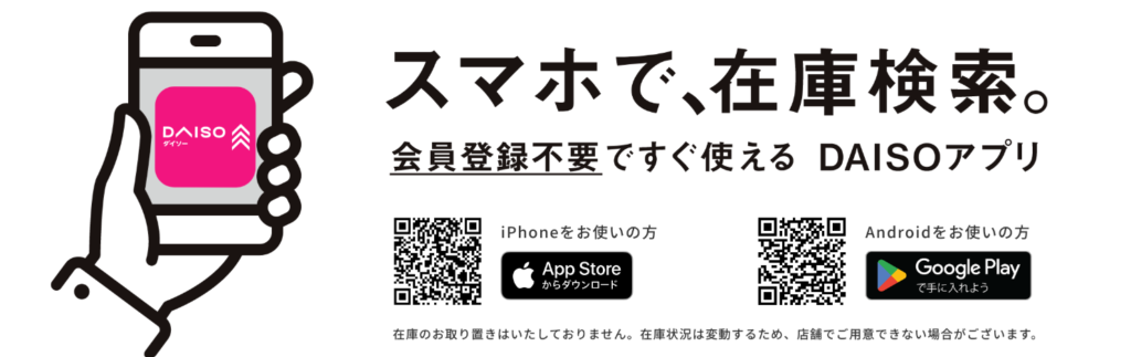 ダイソーの在庫検索は、公式の「DAISOアプリ」をインストールするだけで、面倒な会員登録なしですぐに利用できます。