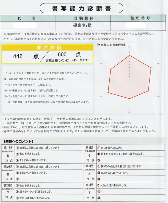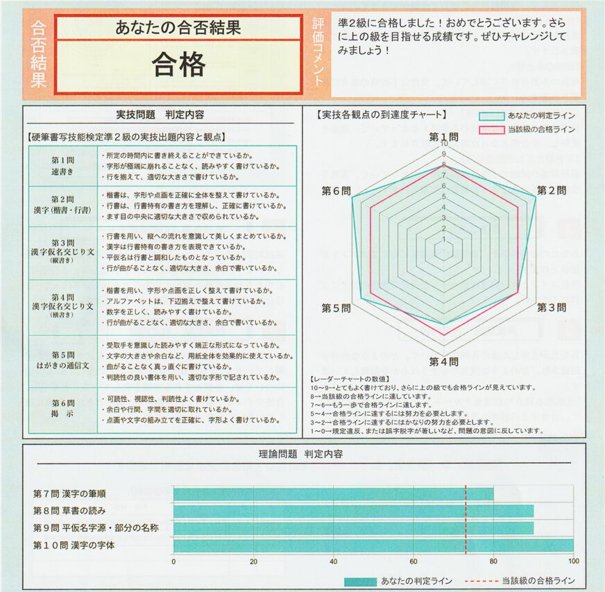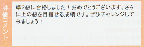 半数の問でボーダーラインを超える評価をいただくことができ、全体としても上の級を目指せるとのコメントをいただきました。
