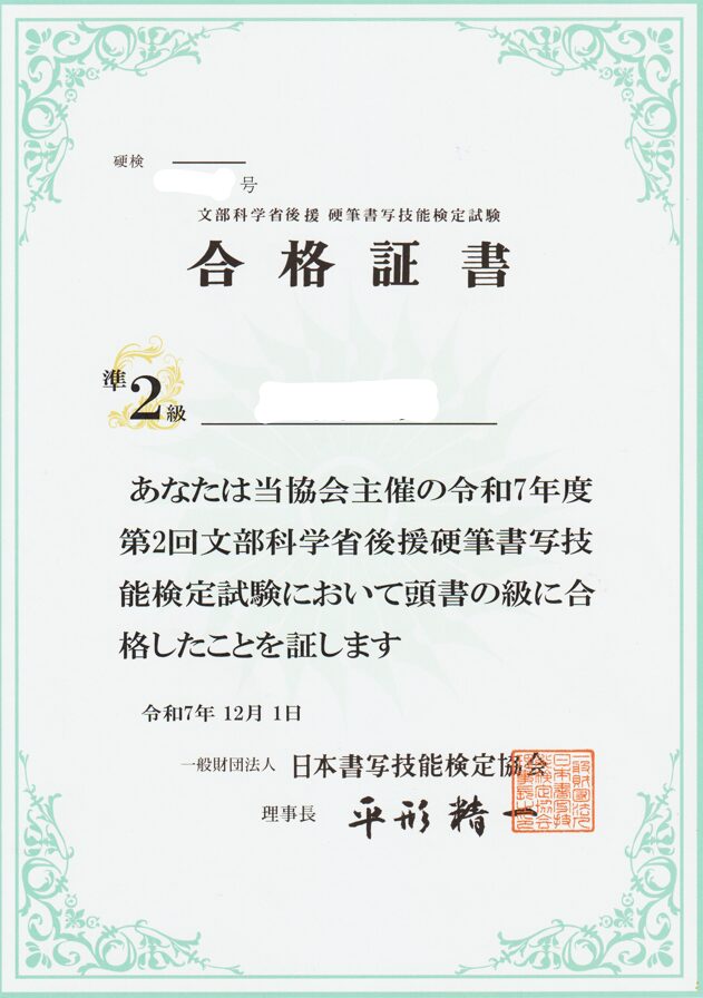 合格すれば資格として『○年第○回文部科学省後援硬筆・毛筆書写技能検定○級合格』と履歴書に書くことができます。